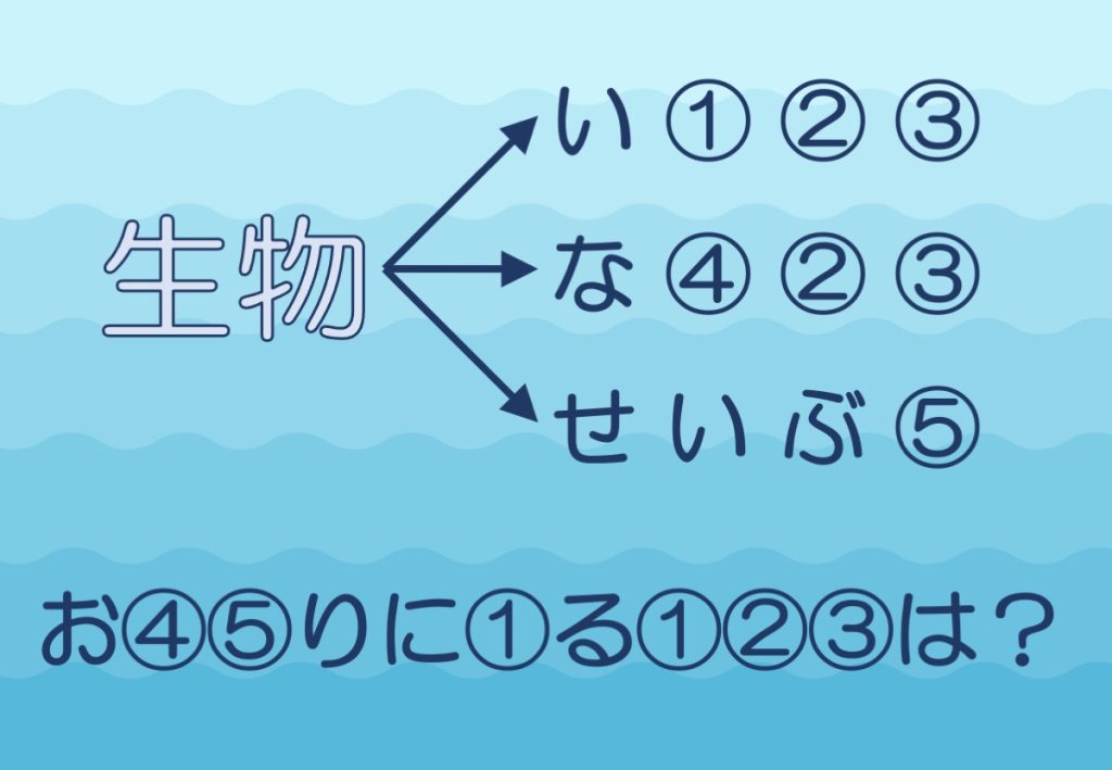 「生物」の3つの読み方は、「いきもの」「なまもの」「せいぶつ」です。①〜⑤に入るひらがなを問題文に当てはめてみると。。。