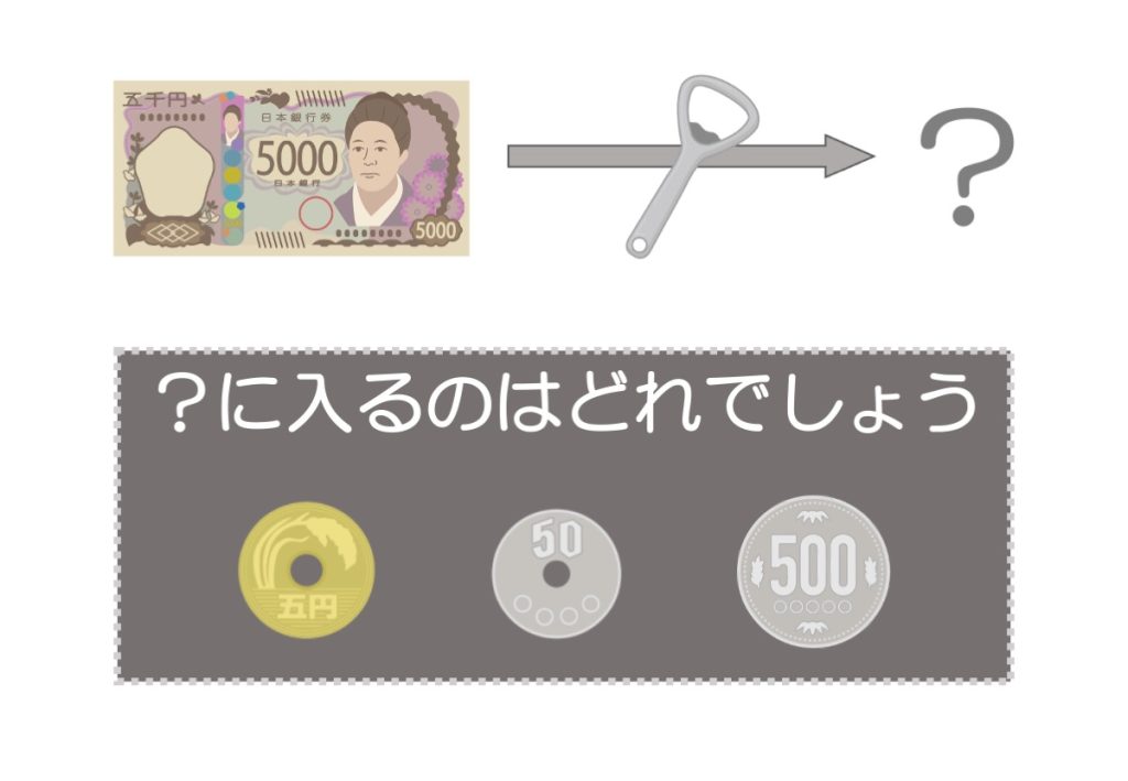 「5000円札(五千円札)のイラスト」から矢印がでて「?」につながっています。矢印には「栓抜きのイラスト」が途中にあります。「?に入るのはどれでしょう」という問題の答えを3つの硬貨のイラストから選ぶようです。「5000円」が「栓抜き」のある矢印を通してこの3つの硬貨のどれかに変化する理由を考えてみましょう。