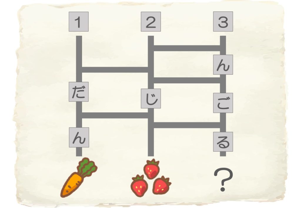 あみだくじを解いてみると「1」は「イチゴ」、「2」は「ニンジン」にたどり着きます。たどる時に通る「ひらがな」をみると「1(いち)」→「ご」→「イチゴ」、「2(に)」→「ん」→「じ」→「ん」→「ニンジン」になりますね。同じように「3」→「?」の間もみてみましょう。