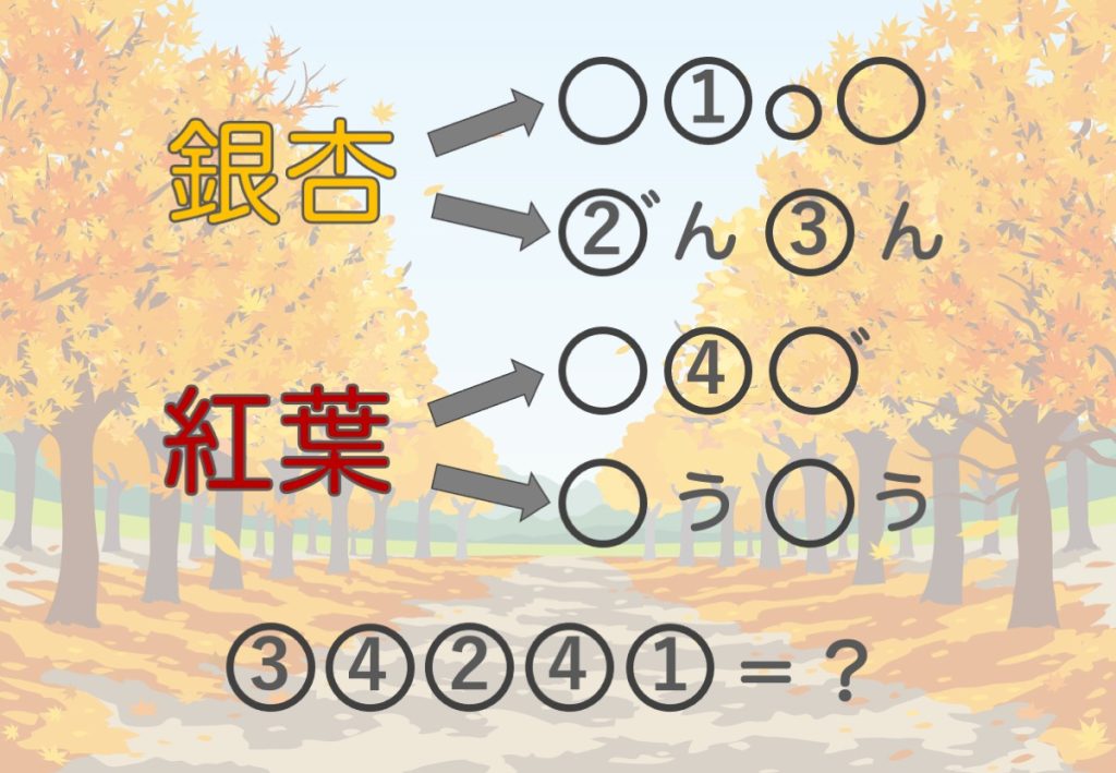 まずは、漢字の「銀杏」と「紅葉」の読み方を考えてみましょう。○にはひらがな1文字が入ります。