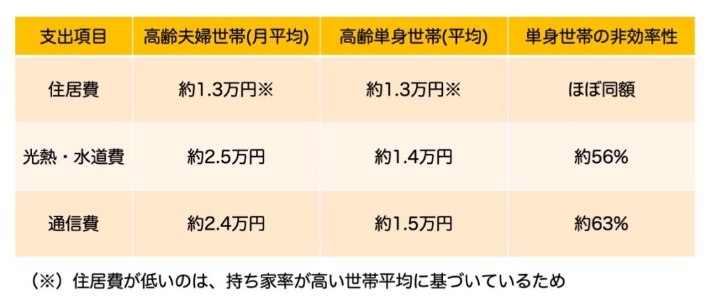 おひとりさまの老後資金が少なく見える最大の理由は、支出総額(約16.2万円)が夫婦の支出総額(約28.7万円)の半分強(約56%)に収まっているからです。「規模の経済」が働かない単身世帯が抱える非効率なコストパフォーマンスが理由にあります。