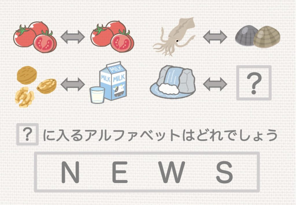 イラストはそれぞれ上の段の左から、「トマト」⬌「トマト」、「イカ」⬌「カイ」、「クルミ」⬌「ミルク」です。⬌で繋がれたイラスト同士反対から読んで出来上がる言葉になっています。下の段の右のイラストは「滝(タキ)」です。「タキ」を反対から読むと・・・